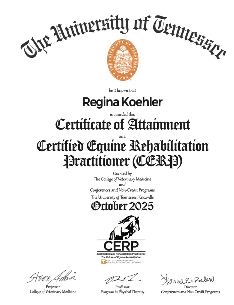 Tools and instruments: exercises and training to achieve performance goals (dressage, race horses, show jumping, trail, endurance, western, working equitation, etc.). Restoration of functional posture using best practices in equine physiotherapy.