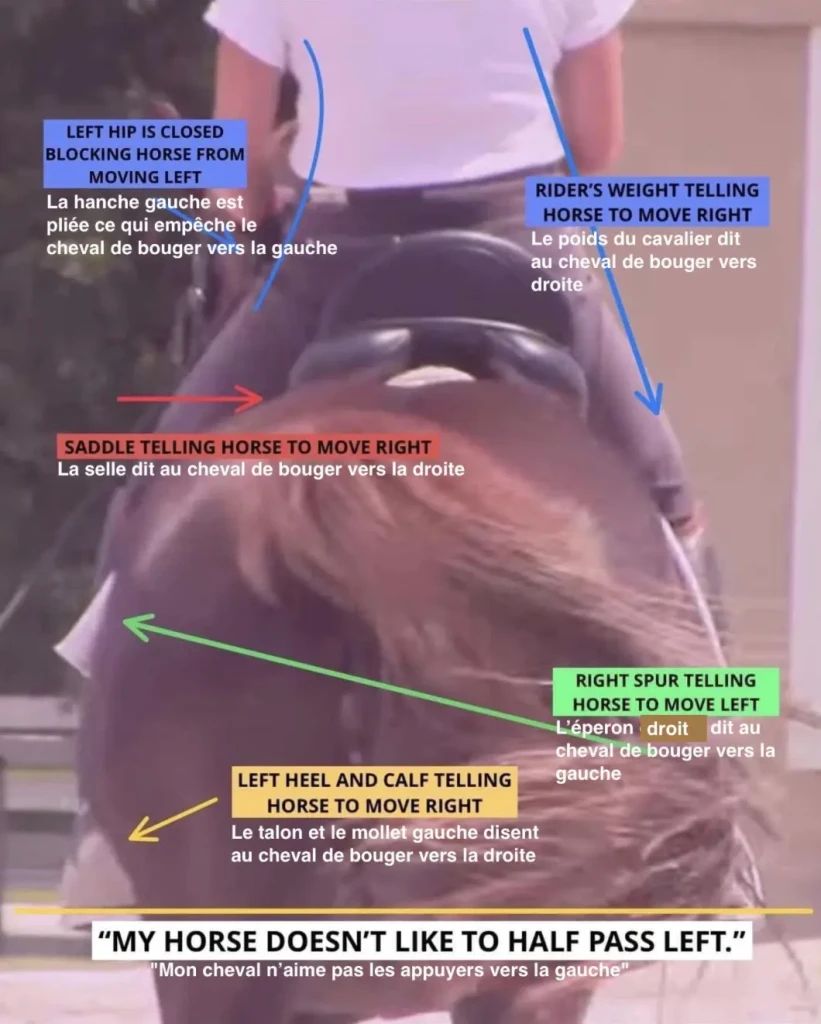 Schöneich et al. (Die Kraft der Diagonalen): idem, selon ces auteurs, c’est précisément le mal-être crée par un corps encore très asymétrique qui fait que ce cheval refuse d’avancer.