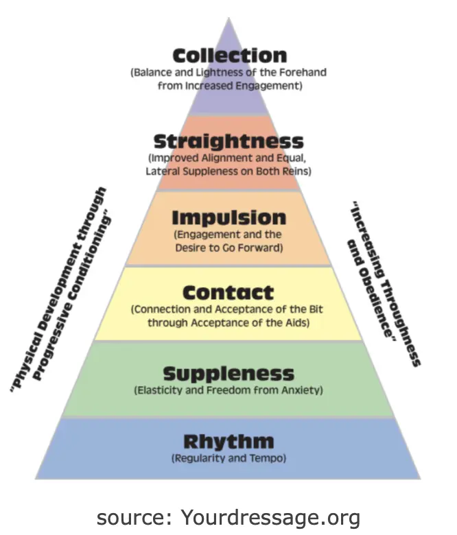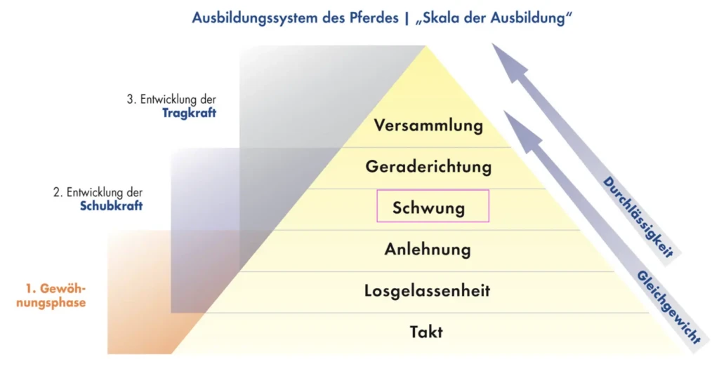 L’échelle de progression est en effet d’origine allemande (« Ausbildungsskala des Pferdes » ou « Skala der Pferdeausbildung »). La réaction ci-dessus me permet de compléter avec un autre point également essentiel.