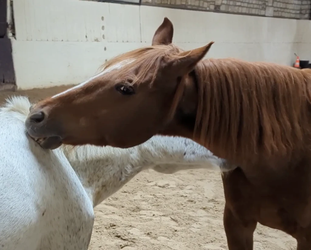 La réciprocité est importante pour les chevaux, un cheval qui apprécie le grooming va aussi essayer de vous faire du grooming, attention aux mordillements..